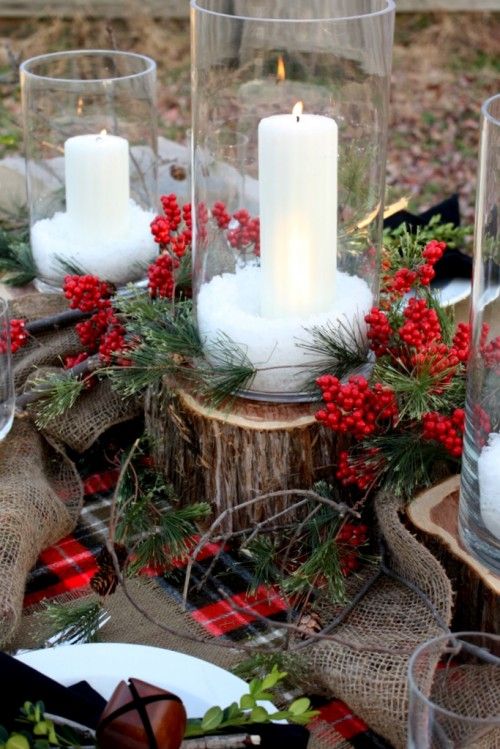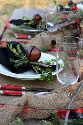 Claves. Vasos, manteles y cubertería en material craft y madera, decoración con toques rojos como bastoncillos de caramelo y servilletas de rayas blancas y rojas
