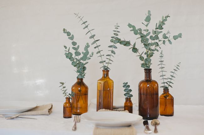 Get the look. Eucalipto, floristerías, mejor natural. Recubrimiento de pelo para sillas, IKEA. Botellas o damajuanas para decoración floral, Deko palace. Cubertería y vajilla, Zara Home