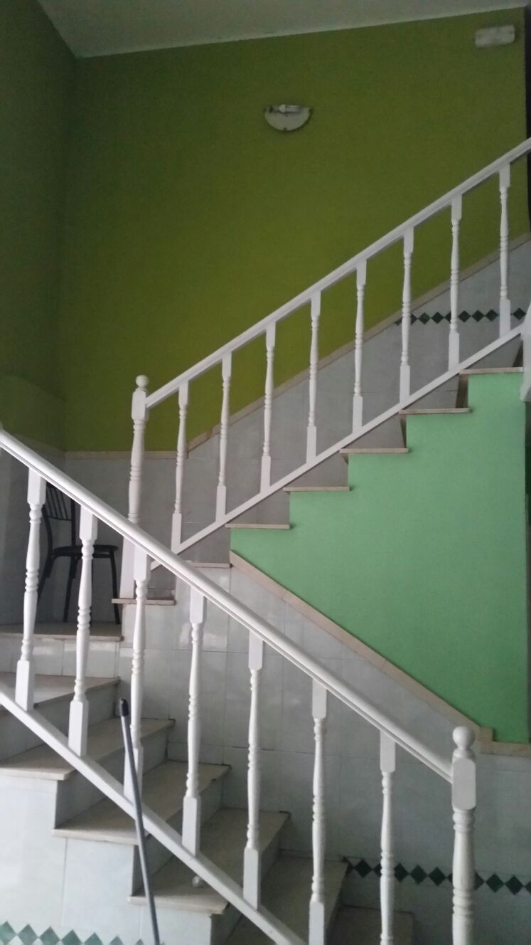 La escalera, uno de los elementos clave de la decoración, la transformamos forrando los escalones con el mismo tipo de madera de la barra, combinada con azulejos de dibujos geométricos.