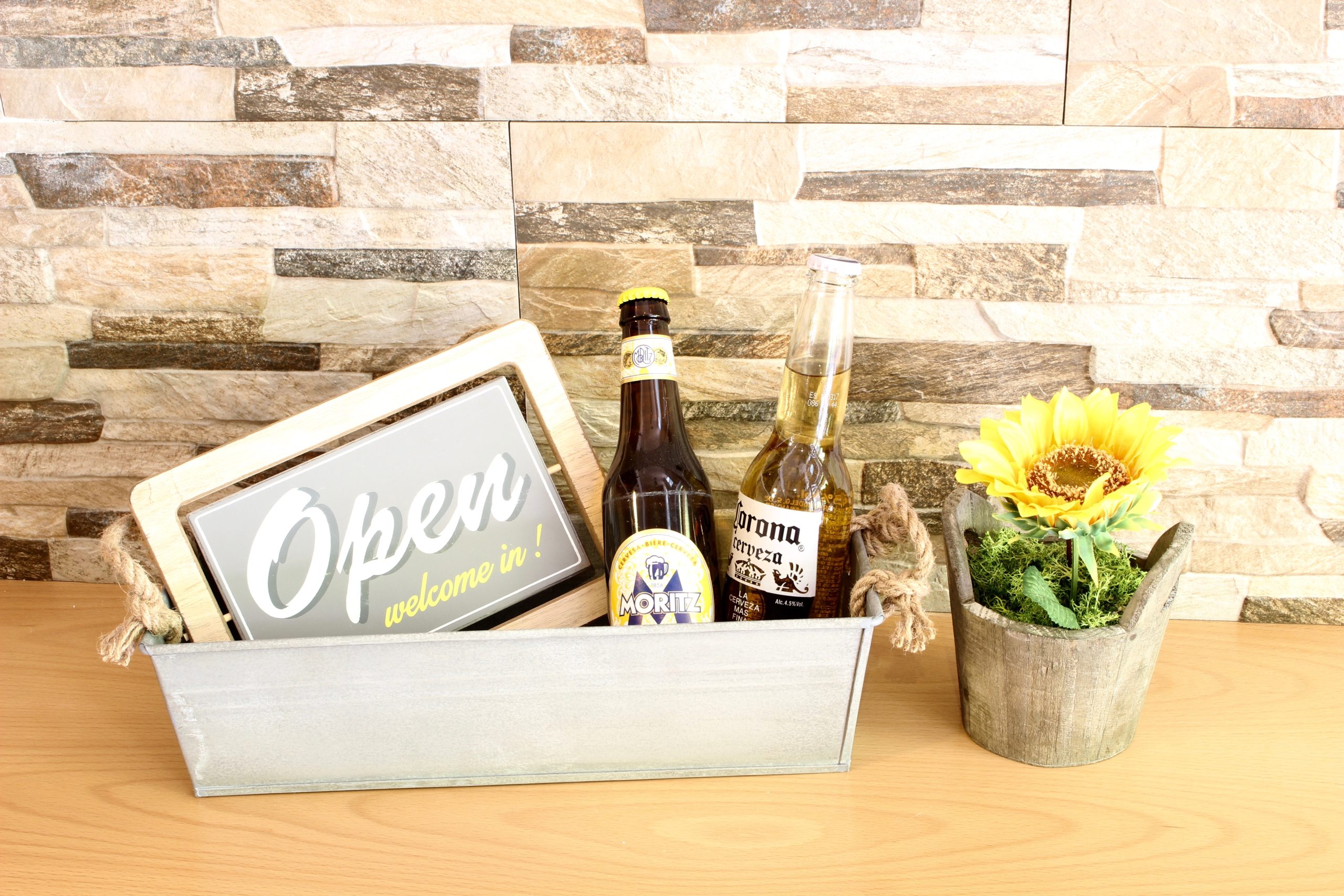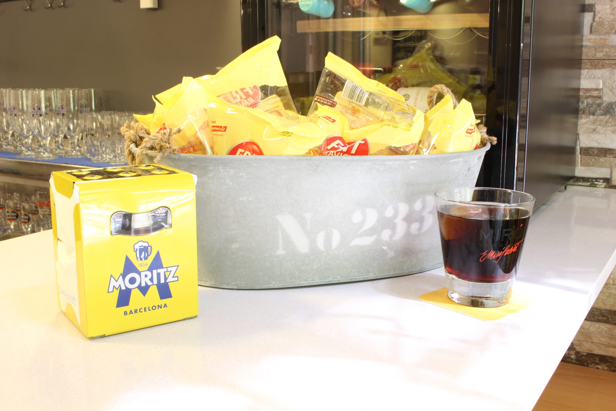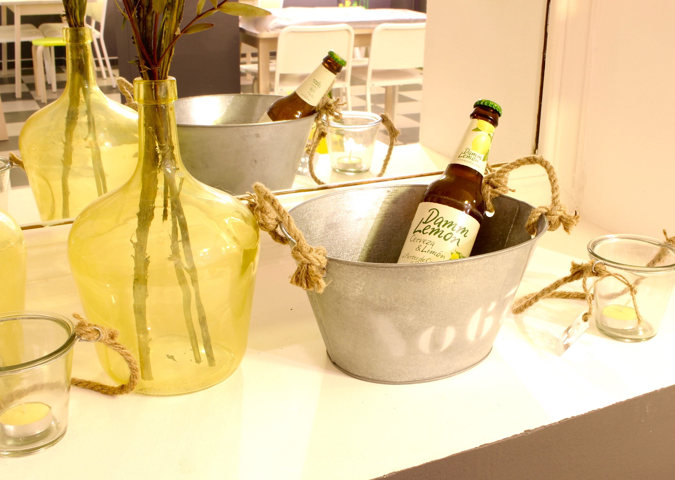 Detrás de la barra, todos los elementos de almacenaje en blanco y amarillo contrastan con el gris antracita de la pared, el ambiente «industrial vitaminado» lo conseguimos con los taburetes Tolix amarillos en diferentes formatos.