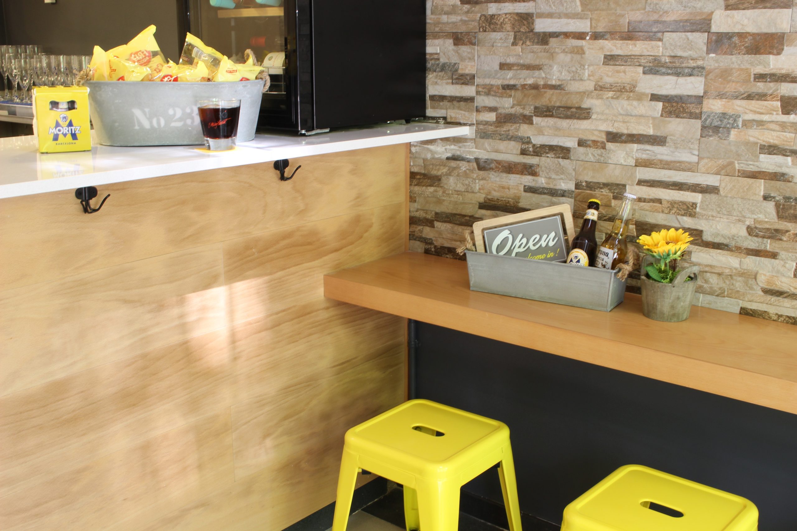 En la parte de la entrada, sustituimos el gran espejo por una pared de piedra, y creamos una barra baja con conexiones en la parte inferior, ideal para tomar un buen desayuno mientras revisas el correo en el laptop.