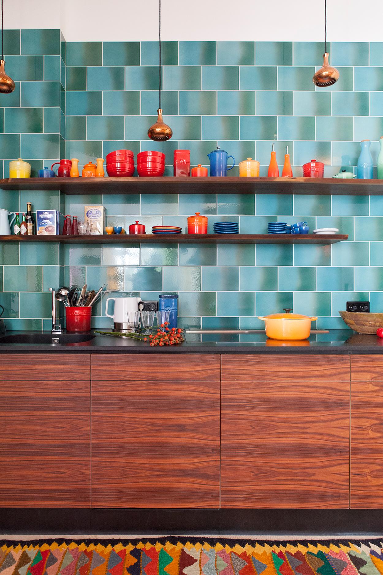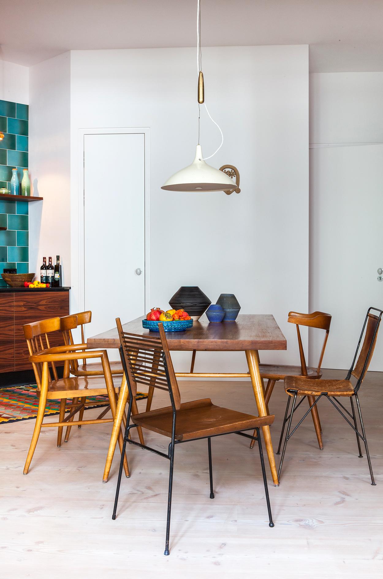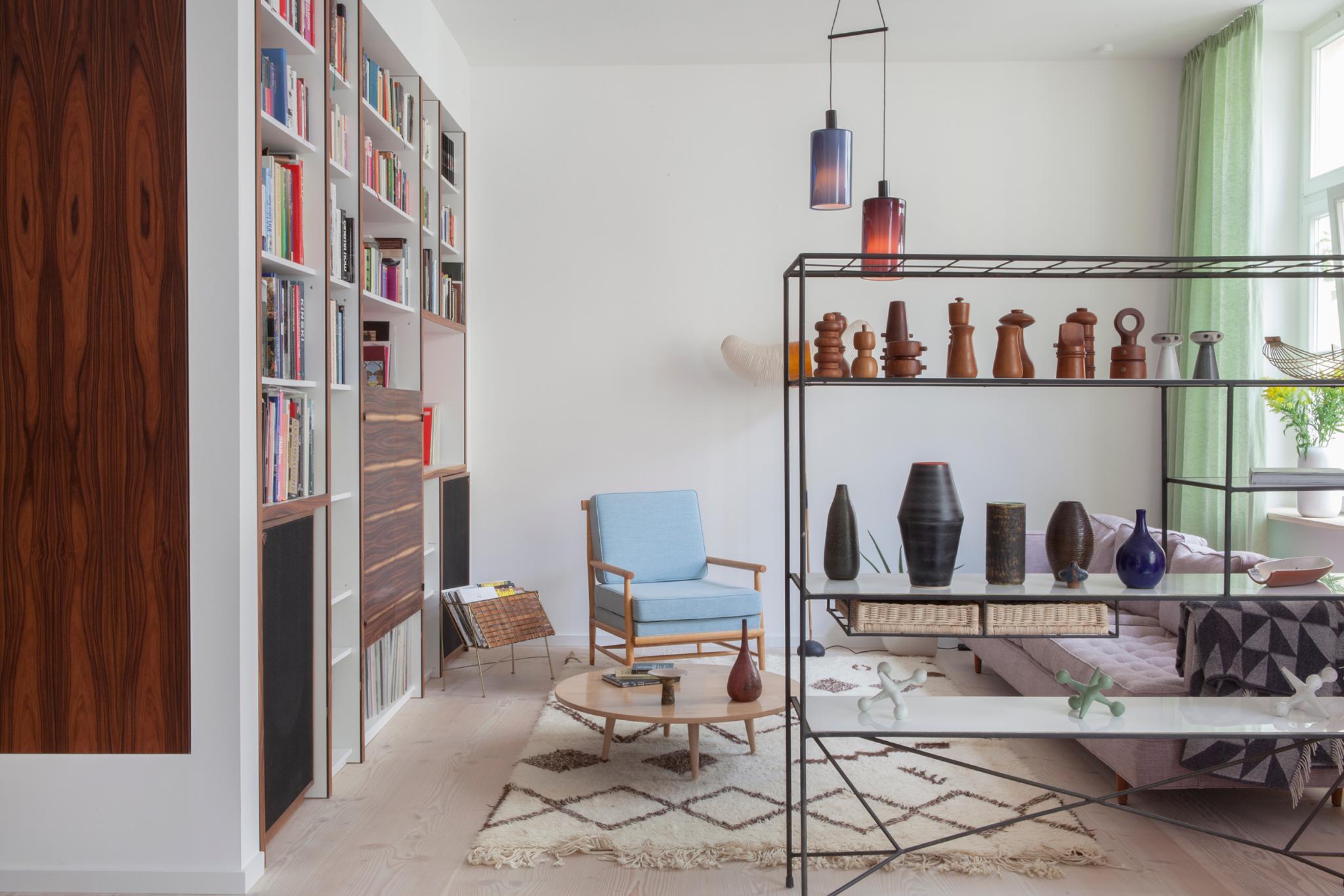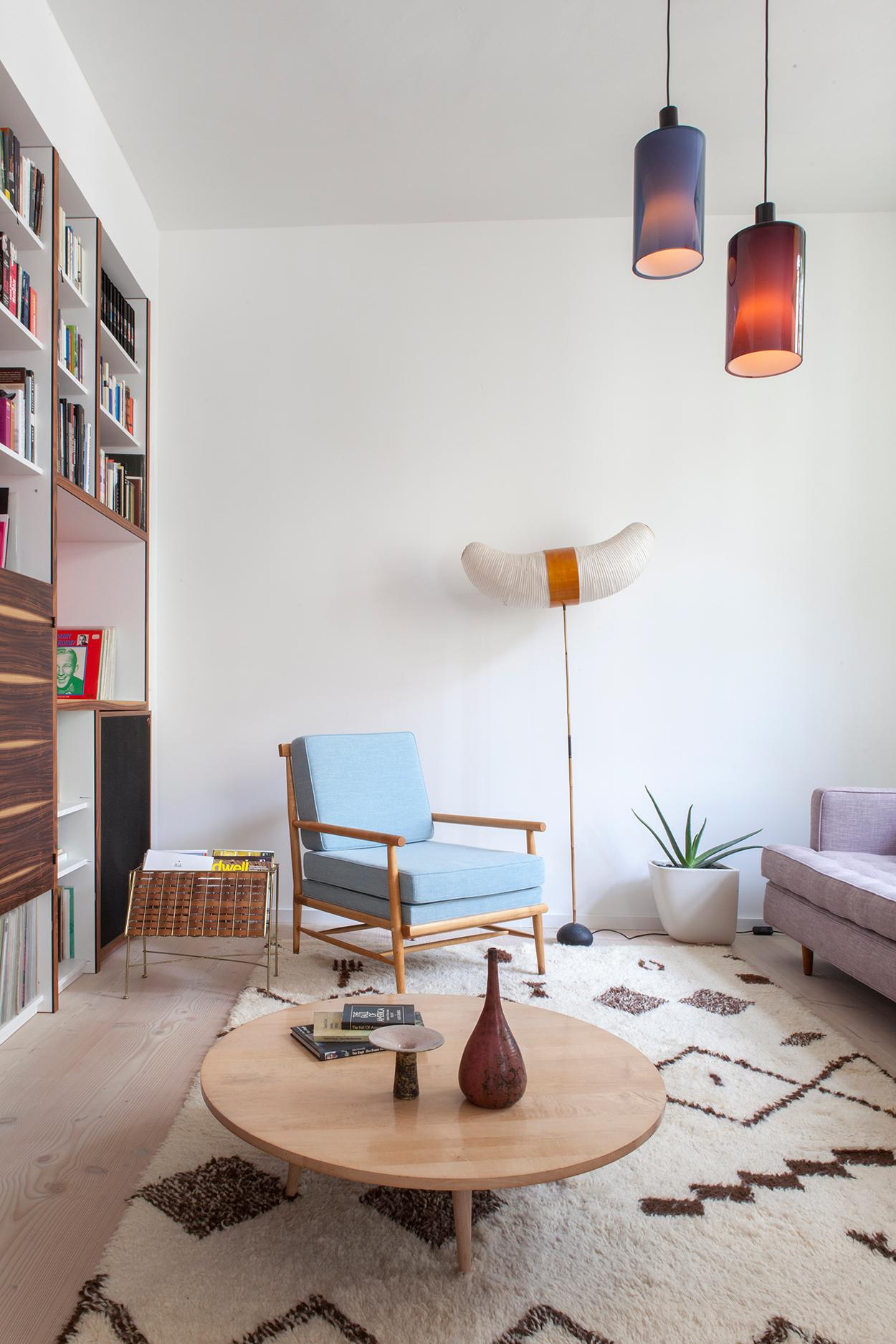 Por este motivo, nuestra búsqueda de inspiración constante para ofrecer las mejores ideas, nos hizo toparnos con este apartamento Berlinés de alquiler, que nos prendó por la mezcla arriesgada, pero acertadísima, de elementos muy propios de la edad de Oro del diseño (50’s) en su salón office (maderas con marcadas vetas, azulejos en degradée, mueble bar con detalles de rejilla o mobiliario propio del matrimonio Eames, Arne Jacobsen o Eero Saarinen) junto con lanas, presentes en las alfombras Beni Ouarain, el metal y el mármol de la estantería, que dibuja dos ambientes o el tejido de visillo bicolor que enmarca las ventanas.